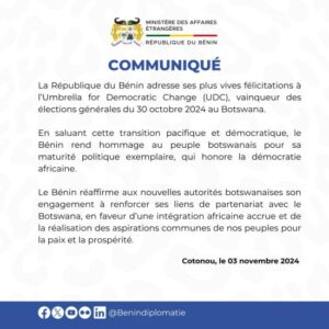La République du Bénin a chaleureusement félicité la coalition d’opposition botswanaise, l’Umbrella for Democratic Change (UDC), pour sa victoire aux élections générales du 30 octobre 2024.