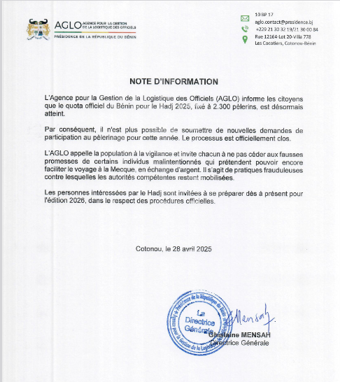 Malgré la clôture du processus, des individus malintentionnés continuent de proposer de fausses offres, promettant un accès tardif au pèlerinage en échange d’argent. Dans un communiqué, la Directrice générale de l’AGLO appelle à la vigilance.