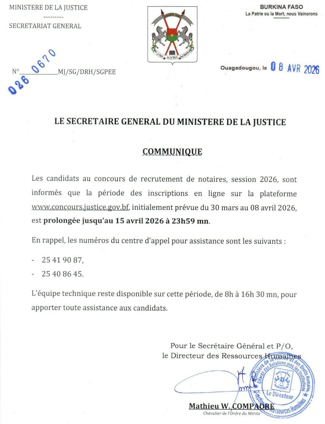 Les candidats au concours de recrutement de notaires, session 2026, sont informés que la période des inscriptions en ligne, initialement prévue du 30 mars au 8 avril 2026, est prolongée jusqu’au 15 avril 2026 à 23h59.